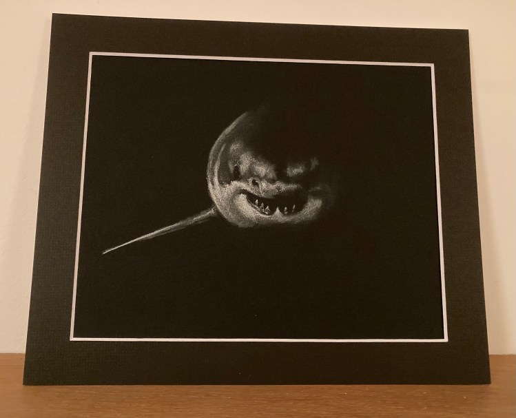 Print from an original white pastel study of a great white shark.