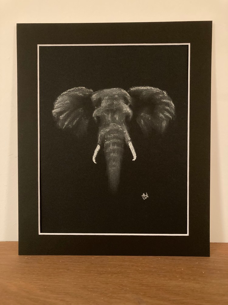 Print from an original white pastel study of an African elephant.