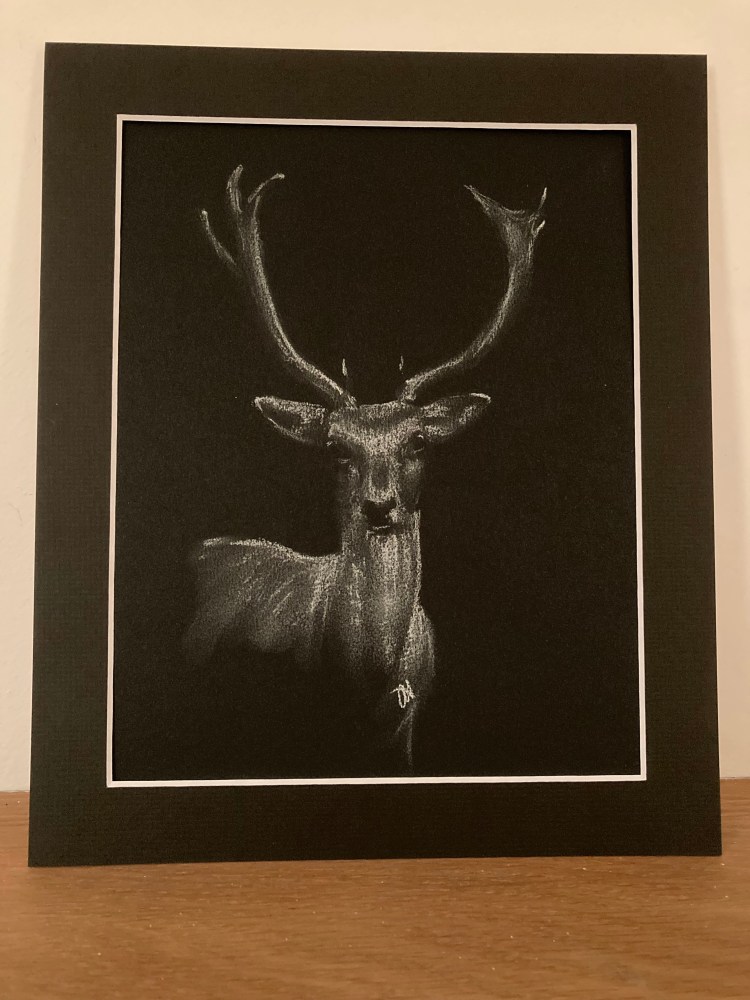 Print from an original white pastel study of a white Fallow deer buck.
