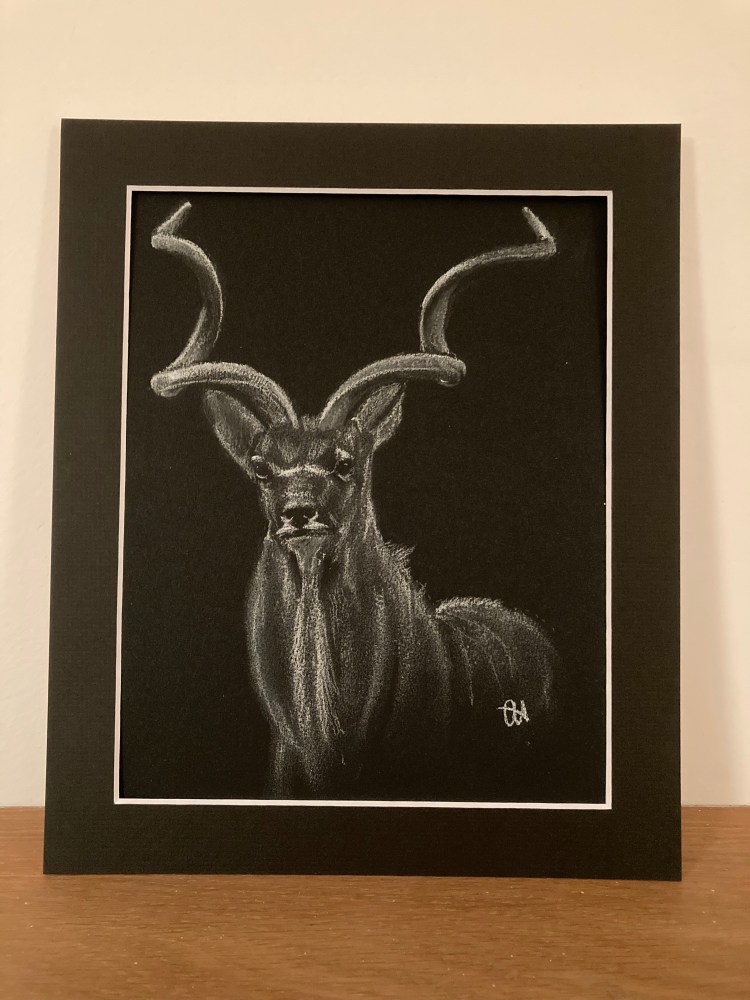 Print from an original white pastel study of a Kudu bull.